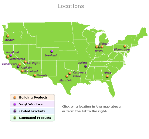 Anaheim, CA (coating facility) Bloomsburg, PA Bristol, IN Buena Park, CA (Patio Products) Elkhart, IN (Laminated Products) Elkhart, IN(RV Doors) Helena, AR (coating facility) Loveland, CO (Vinyl Windows) Mansfield, TX N. Las Vegas, NV (Patio Products) Phoenix, AZ (Patio Products) Plano, TX (Corp. HQ) Romoland, CA Sacramento, CA (Patio Products) Stayton, OR Tifton, GA Woodland, CA (Vinyl Windows) |